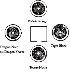Le Dragon à l’Est - Noir ou d'Azur- (gauche du tableau), le Tigre à l’Ouest (droite du tableau), le Phénix et la Tortue au Sud ou Nord (haut ou bas du tableau).