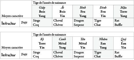 Repérer votre tige de l’année de naissance. Reporter le moyen caractère ‘Destructeur’ à cheval entre les deux cases animaux mentionnées.