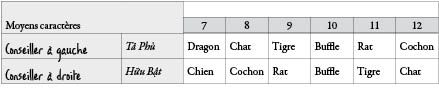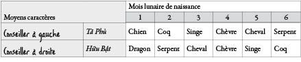 Repérer la branche correspondant à votre mois lunaire dans le tableau ci-dessous et reporter Conseiller à Gauche et Conseiller à Droite dans les cases des animaux mentionnés de votre tableau de l'Empereur.